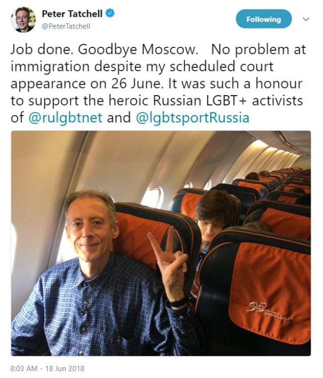 Tatchell confirmed: “Job done. Goodbye Moscow. No problem at immigration despite my scheduled court appearance on 26 June.