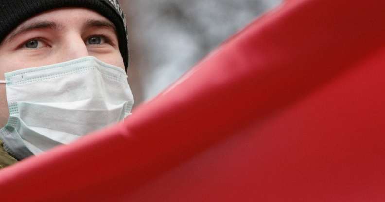 A Russian FrontAIDS with a Red Ribbon, a sign of support for people living with HIV on his cap protests in downtown Moscow, 28 November 2006 (Photo by Denis Sinyakov/AFP/Getty Images)