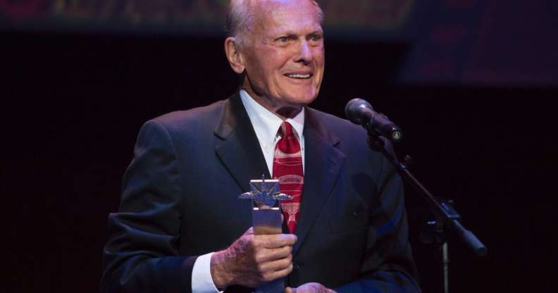 US actor Tab Hunter holds “Mayahuel” award during the 31th Guadalajara International Film Festival in Guadalajara on March 04, 2016. / AFP / Hector GUERRERO (Photo credit should read HECTOR GUERRERO/AFP/Getty Images)