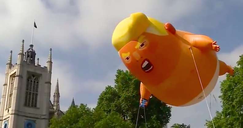 The giant ‘Trump Baby’ coincides with Trump’s four-day state visit to the UK, and is currently sailing over Parliament Square in central London.