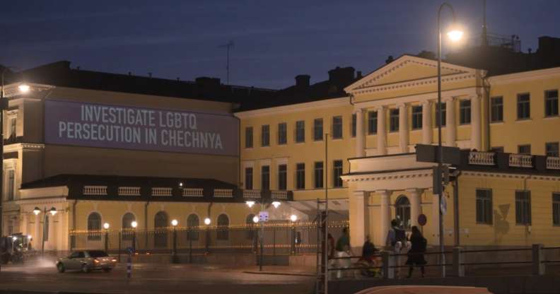 LGBT rights activists have called on Donald Trump and Vladimir Putin to address the anti-gay purge in Chechnya, by projecting a giant message onto the front of the building where they are set to meet.