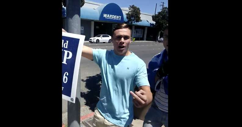 Footage of 18-year-old wrestler Bronson Harmon holding a pro-Donald Trump sign, making an obscene gesture and shouting “f**k off, faggot!” was viewed more than 30,000 times since it was first posted on June 30, the day a Families Belong Together march—protesting the Trump administration policy of separating migrant children from their parents at the border—took place in the city of Modesto, California.