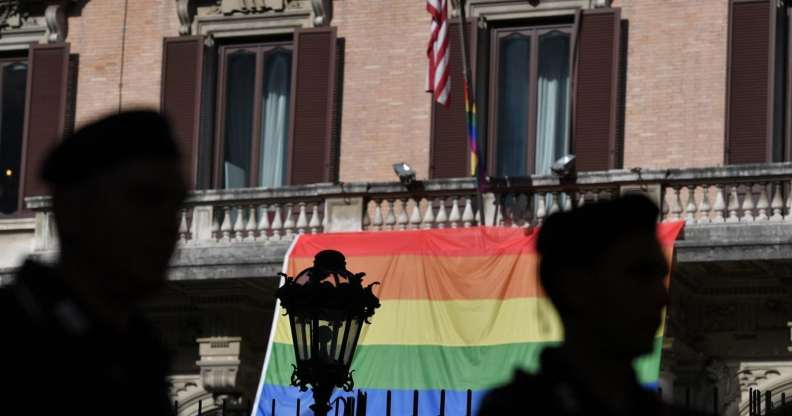 A rainbow flag is hanged on a balcony of the US embassy on June 15, 2016 in Rome to pay tribute for the victims of the Orlando shooting in Florida (TIZIANA FABI/AFP/Getty)