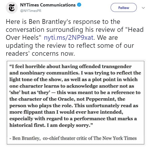 The New York Times‘ theatre critic has apologised for misgendering a character in musical Head Over Heels.
