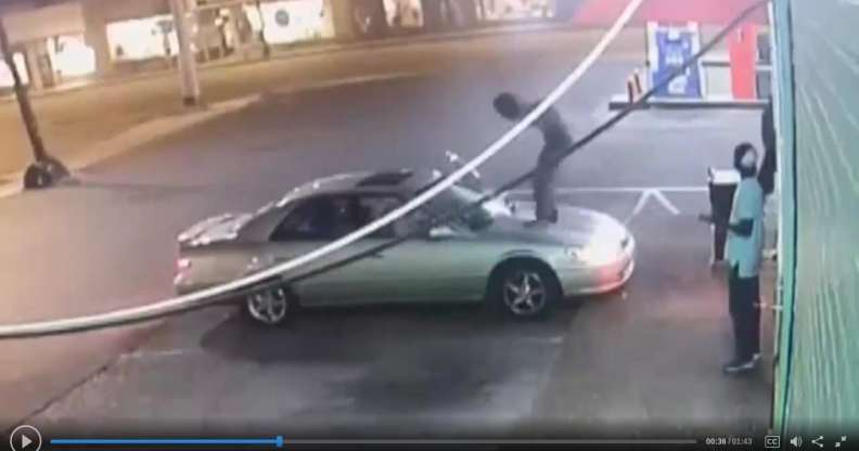 In footage taken by a security camera, the man can be seen suddenly jumping onto Cantrell’s car and kicking in her windscreen.