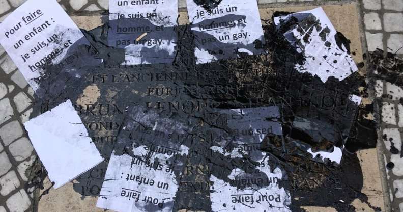 The Paris memorial was covered in dark paint and papers suggesting that only straight men are fit for the purpose of procreation, an act mayor Anne Hidalgo condemned as “a shameful display of homophobia” on Monday.