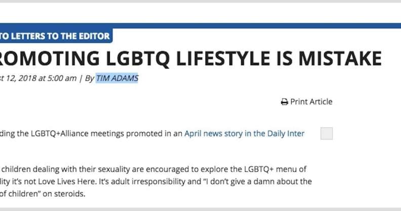 The letter, written by Tim Adams, takes aim at local gay and trans activists and labels them “misguided children”, who “are serving evil and recruiting to increase their ranks.”