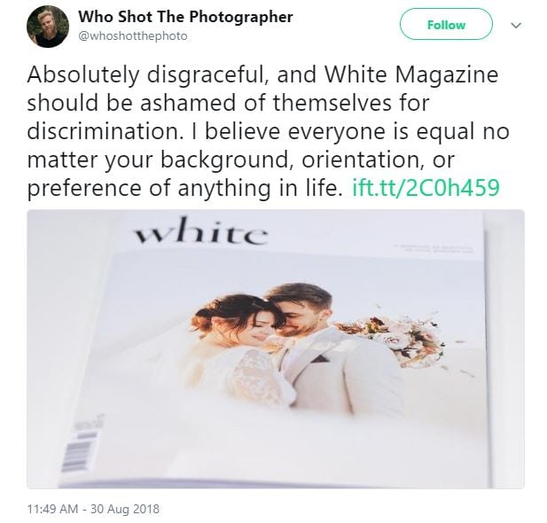 Another photographer added: “Absolutely disgraceful, and White Magazine should be ashamed of themselves for discrimination. I believe everyone is equal no matter your background, orientation, or preference of anything in life.”