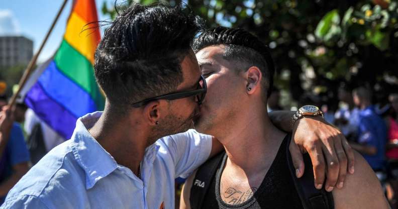 Members of the gay and lesbian community kiss as they participate in a march against homophobia on May 14, 2016 in Havana. / AFP / YAMIL LAGE (Photo credit should read YAMIL LAGE/AFP/Getty Images)