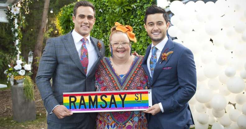 Aaron Brennan and David Tanaka will tie the knot on the Australian soap in an episode airing in the UK on Monday, with the help of celebrity officiant Magda Szubanski of Australian comedy Kath & Kim, who has been a prominent activist in the fight towards marriage equality.