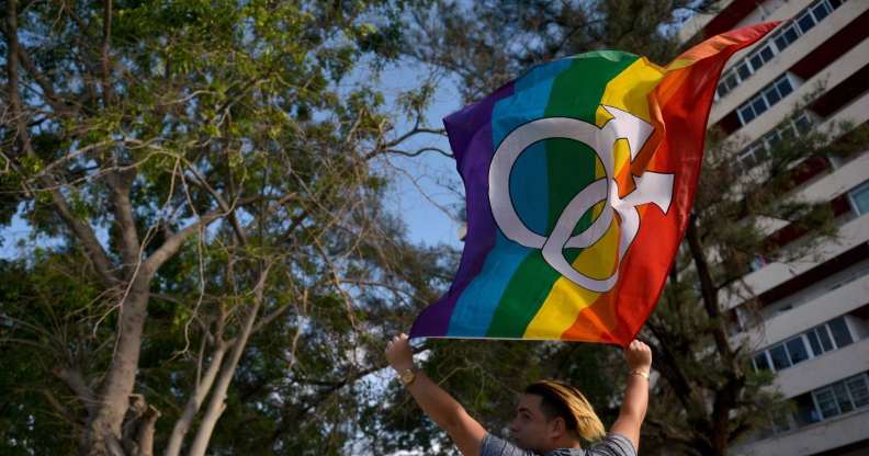 Participants carry a large flag as they take part in a Gay Pride procession in Hong Kong on November 10, 2012. As anti-discrimination laws continues to expand globally, the participant marched to promote equal rights for lesbian, gay, bisexual and transgender (LGBT). AFP PHOTO / Philippe Lopez (Photo credit should read PHILIPPE LOPEZ/AFP/Getty Images)