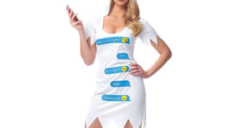 “The costume is a hooded white dress designed to look like a ghost with a series of unanswered texts on the front.”