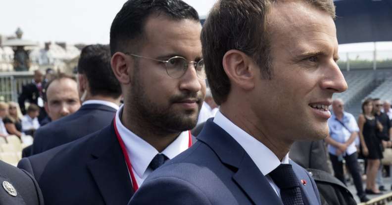 A picture taken on July 14, 2018 shows French President Emmanuel Macron (R) walking ahead of then top security aide Alexandre Benalla at the end of the Bastille Day military parade in Paris. – French President Macron, trying to curb the most damaging scandal of his presidency so far, on July 20, 2018 fired a top security aide who has been taken into custody after videos emerged showing him strike a young man during a demonstration in Paris in May. The Elysee Palace said that Alexandre Benalla, 26, would be dismissed after “new elements” emerged in the case, namely that he is suspected of unlawfully receiving police surveillance footage in a bid to clear his name. A source close to the inquiry said that three police officers, including two high-ranking officials, have been suspended on suspicion of providing the footage to Benalla. He is facing charges of violence by a public official, impersonating a police officer and complicity in unauthorised use of surveillance footage, the Paris prosecutor’s office said. (Photo by PHILIPPE WOJAZER / POOL / AFP) (Photo credit should read PHILIPPE WOJAZER/AFP/Getty Images)