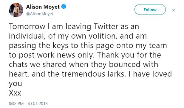 Moyet added: “Tomorrow l am leaving Twitter as an individual, of my own volition, and am passing the keys to this page onto my team to post work news only.