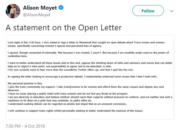 “I will continue to support trans rights whilst personally seeking to better understand the nuances of the issues.”