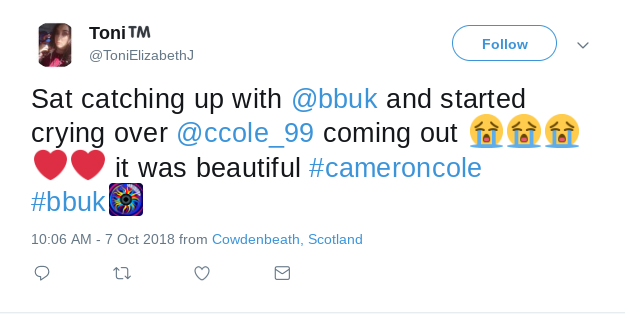 Another wrote: “Sat catching up with @BBUK and started crying over @ccole_99 coming out it was beautiful.”