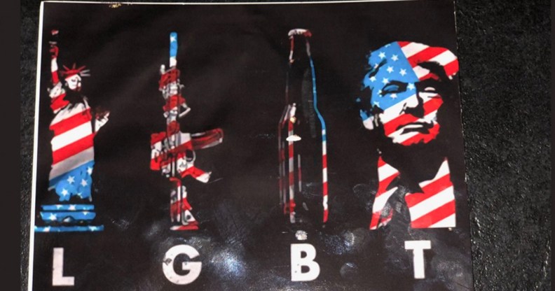 Instead of lesbian, gay, bisexual and transgender, the leaflets have pictures of the State of Liberty, an assault rifle, a beer bottle and President Donald Trump above their corresponding letters—in short, liberty, guns, beer and Trump.