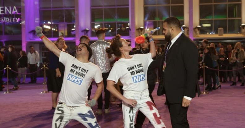Campaigners from ACT UP London — a group fighting to end HIV — and the NHS Anti-Swindle Team, which wants to maintain a publicly run NHS, united to protest on the film’s purple carpet outside Wembley Arena on Tuesday (October 23).