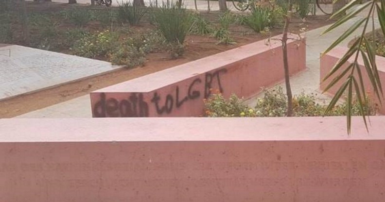The message “death to LGBT” has been graffitied on a memorial to queer people who suffered and died in the Holocaust.