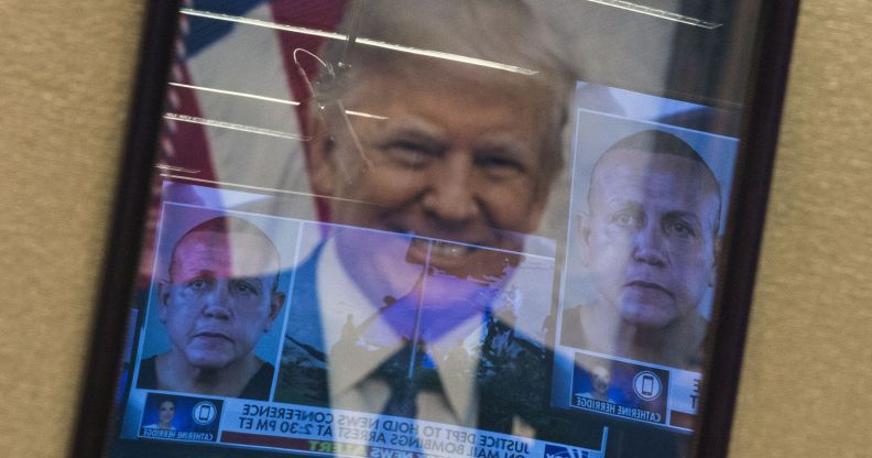 Mugshots of bombing suspect Cesar Sayoc are reflected on a portrait of US President Donald Trump prior to a press conference at the Department of Justice in Washington, DC on October 26, 2018, following the arrest of Sayoc in Florida. – The suspect has been charged with five federal crimes in connection with more than a dozen suspicious packages sent in a US mail bombing spree, Sessions said. (Photo by ANDREW CABALLERO-REYNOLDS / AFP) (Photo credit should read ANDREW CABALLERO-REYNOLDS/AFP/Getty Images)