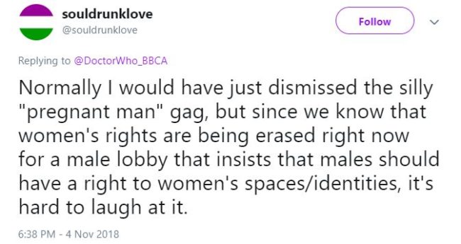 One linked it to a government transgender rights review, claiming: “Normally I would have just dismissed the silly ‘pregnant man’ gag, but since we know that women’s rights are being erased right now for a male lobby that insists that males should have a right to women’s spaces/identities, it’s hard to laugh at it.”