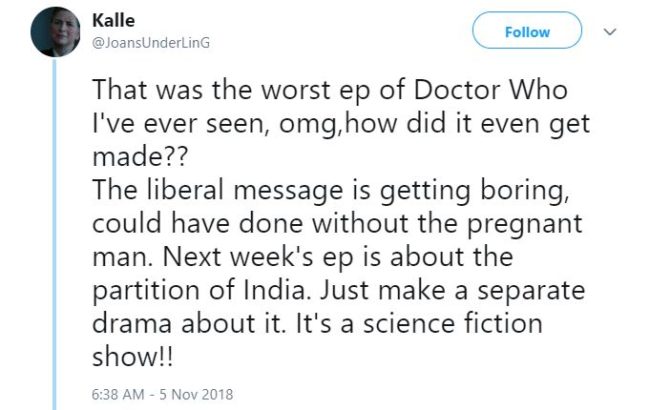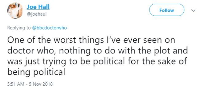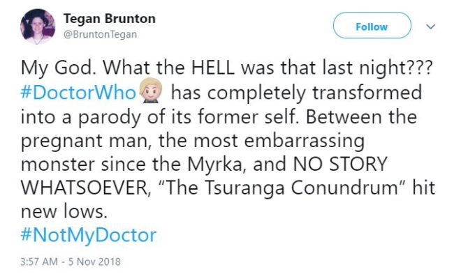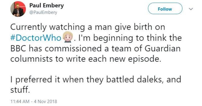 Paul Embery added: “I’m beginning to think the BBC has commissioned a team of Guardian columnists to write each new episode. I preferred it when they battled daleks, and stuff.”