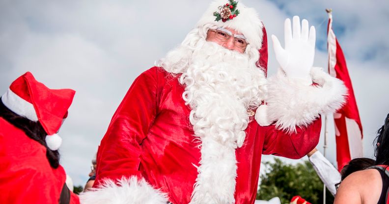 A man dressed as Santa Claus waves as he takes part in a street parade that is part of the annual World Santa Claus congress on July 23, 2018 in Copenhagen. (Photo by Mads Claus Rasmussen / Ritzau Scanpix / AFP) / Denmark OUT (Photo credit should read MADS CLAUS RASMUSSEN/AFP/Getty Images)