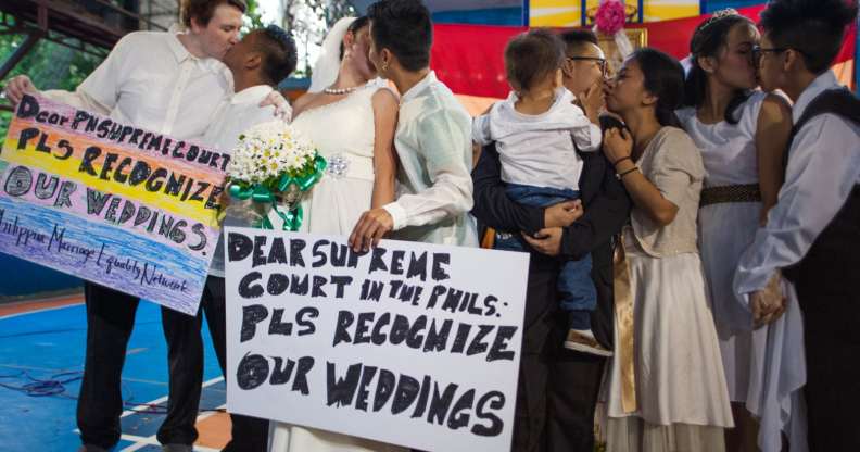Filipino LGBT couples hold placards and kiss their partners during a mass 'wedding rites' on June 28, 2015 in Manila, Philippines. (Dondi Tawatao/Getty)