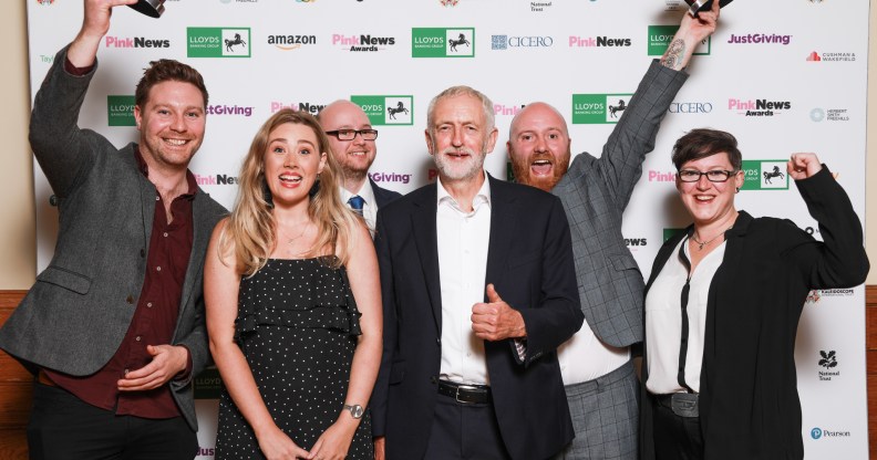 PinkNews Awards 2018: Cara-Friend and The Rainbow Project win Community Group of the Year, presented by Jeremy Corbyn. (Paul Grace)