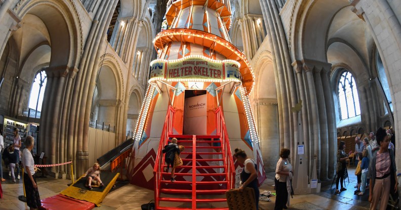 A fifty foot high helter skelter amusement ride has been put up inside the nave of Norwich Cathedral on August 11, 2019 in Norwich, England. (James D. Morgan/Getty Images)