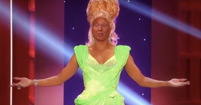 The Trump version of RuPaul wears a ostentatious and voluptuous blond wig twinned with a lime green dress.