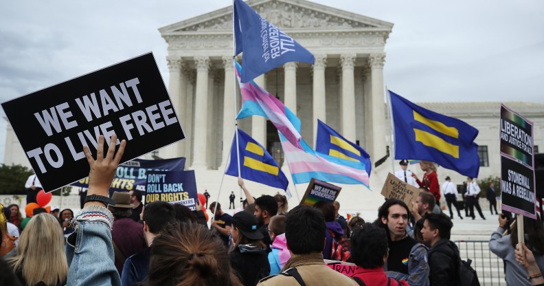 WASHINGTON, DC – OCTOBER 08: Protesters rally in front of the U.S. Supreme Court as arguments are heard in a set of cases concerning the rights of LGBT people in the workforce, on October 8, 2019 in Washington, DC. The cases before the Court are expected to provide the first indication of how it will approach LGBTQI rights since two appointees of President Trump, Justices Neil M. Gorsuch, and Brett M. Kavanaugh joined the bench. (Photo by Mark Wilson/Getty Images)