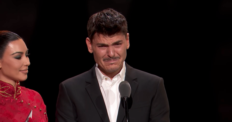 Kim Kardashian comforts her friend, Mario Dedivanovic, as he comes out as gay (YouTube/AIA awards)