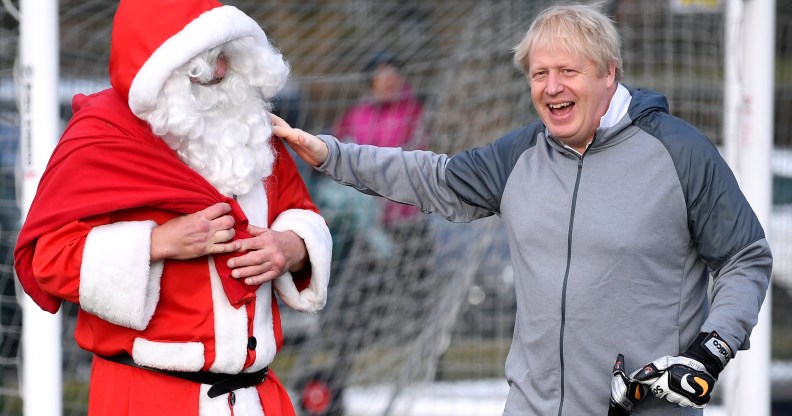 Boris Johnson greets a man dressed as Father Christmas while campaigning in the North West ahead of the general election. (Toby Melville/WPA Pool/Getty Images)