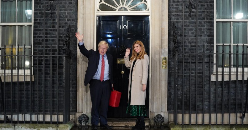 Prime Minister Boris Johnson and Carrie Symonds enter Downing Street as the Conservatives celebrate a sweeping election victory on December 13, 2019 in London, England. (Peter Summers/Getty Images)