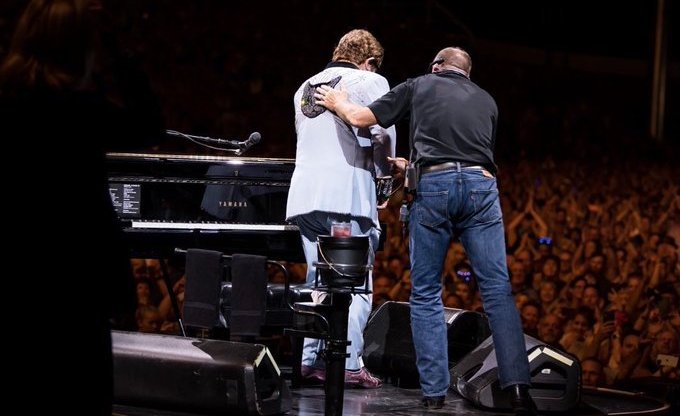 Sir Elton John is escorted off stage mid-way through a February 16 gig in New Zealand after being diagnosed with walking pneumonia. (Twitter/EltonJohnOfficial)