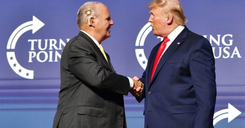 Rush Limbaugh shakes hands with US President Donald Trump during a Turning Point USA event in December 2019. (NICHOLAS KAMM/AFP via Getty Images)