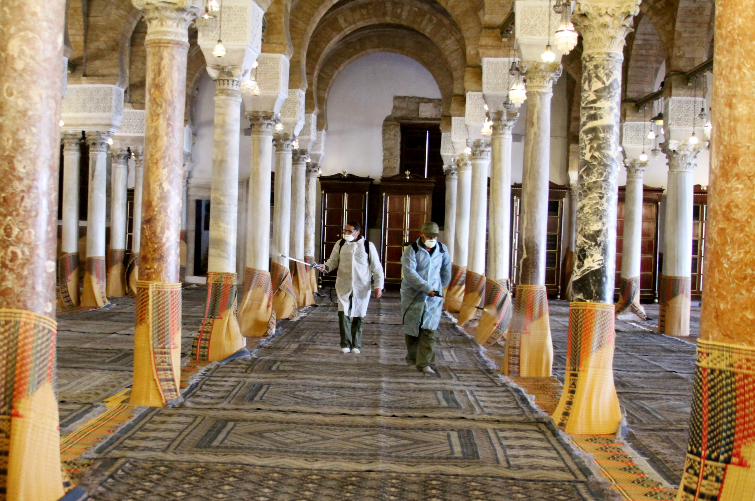 Officials disinfecting the Al-Zaytuna Mosque in Tunisia as protection against the coronavirus (Jdidi Wassim/Echoes Wire/Barcroft Media/Getty)