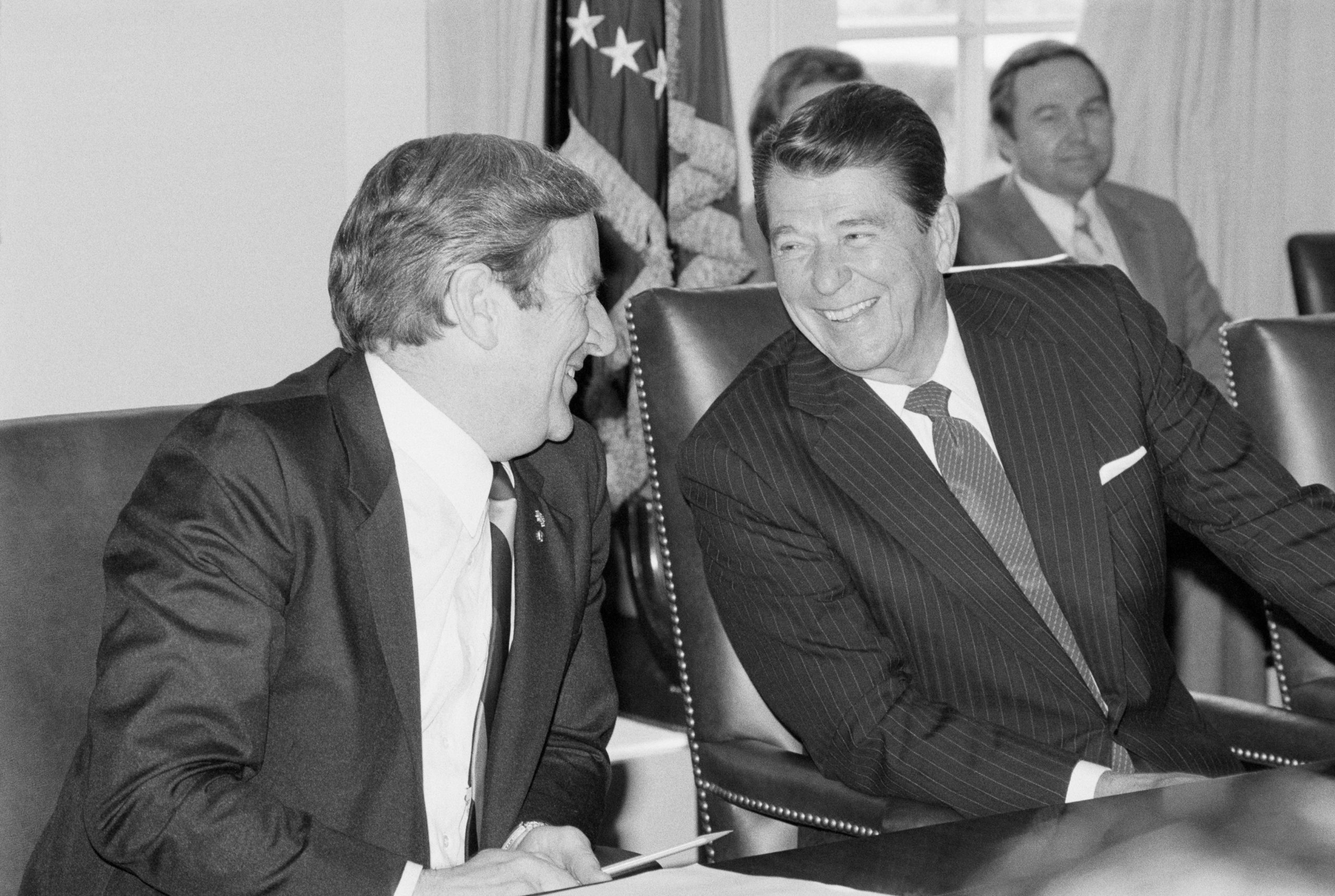 Reagan laughs with Rev. Jerry Falwell in the Cabinet Room, shortly after being told that the government was not doing enough to fight AIDS (BettmanGetty)