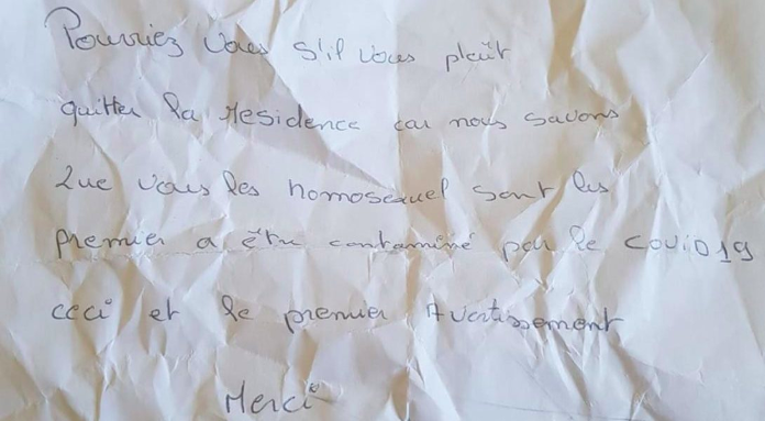 “Could you please leave the residence because we know that you homosexuals are the first to be contaminated by COVID-19,” the note read.
