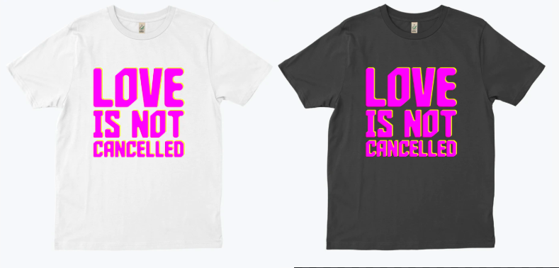 The tees come in two colours and are emblazoned with an important reminder for us all: ‘Love Is Not Cancelled’.