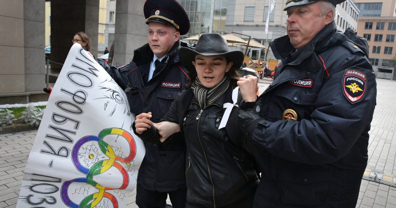 Police detain an LGBT+ activist protesting against Russia’s ‘gay propaganda’ law in Moscow in 2013. (Alexander Nemenov/AFP/Getty)