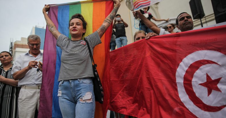 A woman raises the LGBT+ flag at a National Women’s Day demonstration in Tunisia on August 13, 2018 (Chedly Ben Ibrahim/NurPhoto/Getty)