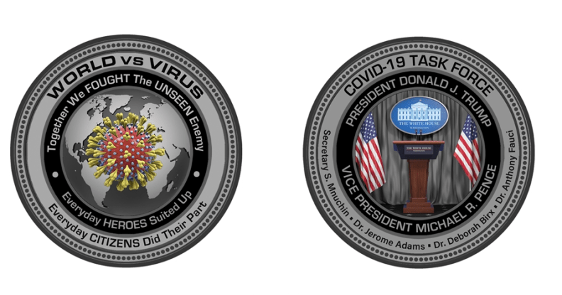 The coin, which costs $125 to pre-order, has a graphic of coronavirus on one side and on the other side shows the presidential podium.