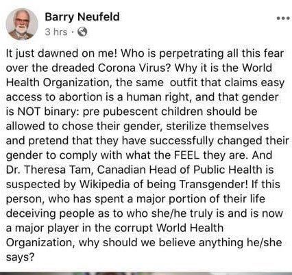Barry Neufeld is an elected trustee for the Chilliwack School District in British Columbia, Canada. He recently took to social media to cast doubt on the WHO’s approach to coronavirus and attack the organisation for its support of trans rights and abortions.