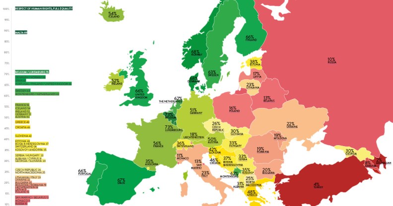 The annual Rainbow Map ranking has named Poland, Russia, Turkey and Azerbaijan as some of the worst countries to be LGBT+ in Europe, while the UK continues to slide down the rankings.