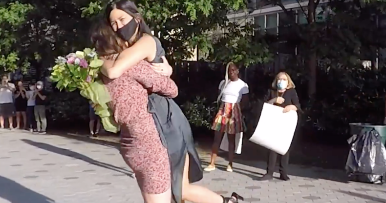 When the coronavirus pandemic kept a nurse apart from her girlfriend for three months, she enlisted the help of her neighbours to make their reunion unforgettable.