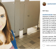 Transphobic attacker gets cis man to ‘intimidate’ trans woman in women’s bathroom.