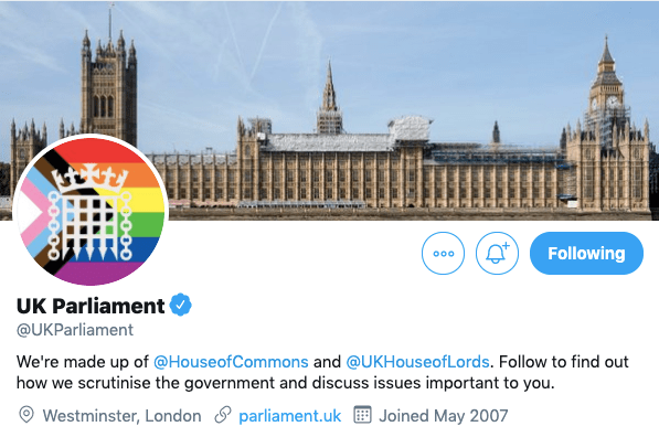 On Thursday (June 25) the Twitter accounts for UK Parliament, the House of Commons and the House of Lords changed their profile pictures to the Progress Pride flag overlaid with parliament’s portcullis symbol.