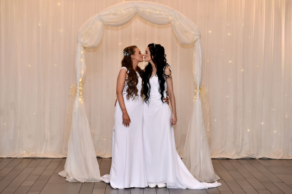 Robyn Peoples and Sharni Edwards on their wedding day in Carrickfergus, Northern Ireland. (Charles McQuillan/Getty)